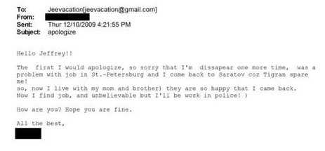 Переписка между ними велась в период с мая по октябрь 2009 года. У девушки возникали трудности с оформлением документов в Санкт-Петербурге, что было связано с её регистрацией в Саратове. Изначально она планировала вернуться на родину для урегулирования бюрократических вопросов, рассчитывая провести там около двух недель. Однако из последнего сообщения следует, что она осталась там навсегда.